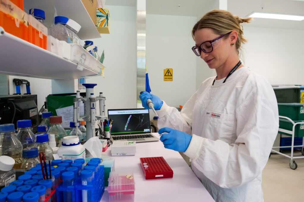 As part of her fellowship, Dr Czislowski is investigating DNA nanoparticles – extremely small DNA-based structures – and whether they can be developed to interact with fungi and used in a similar fashion to fungicides.